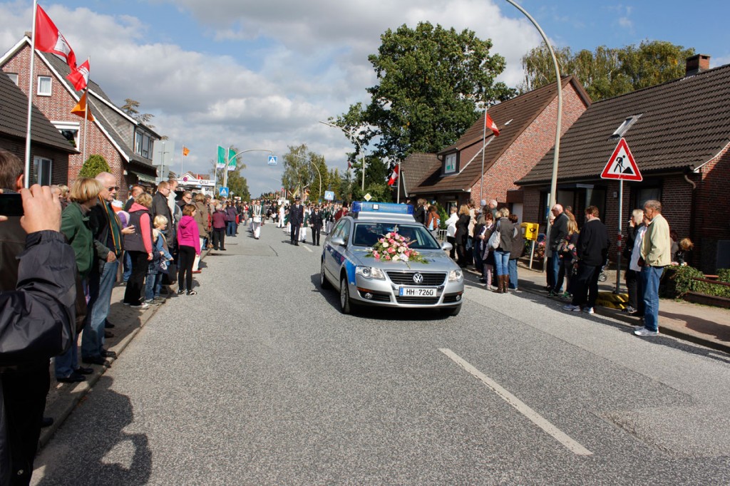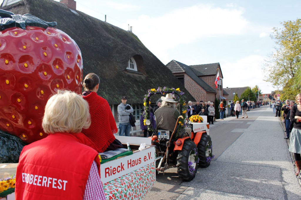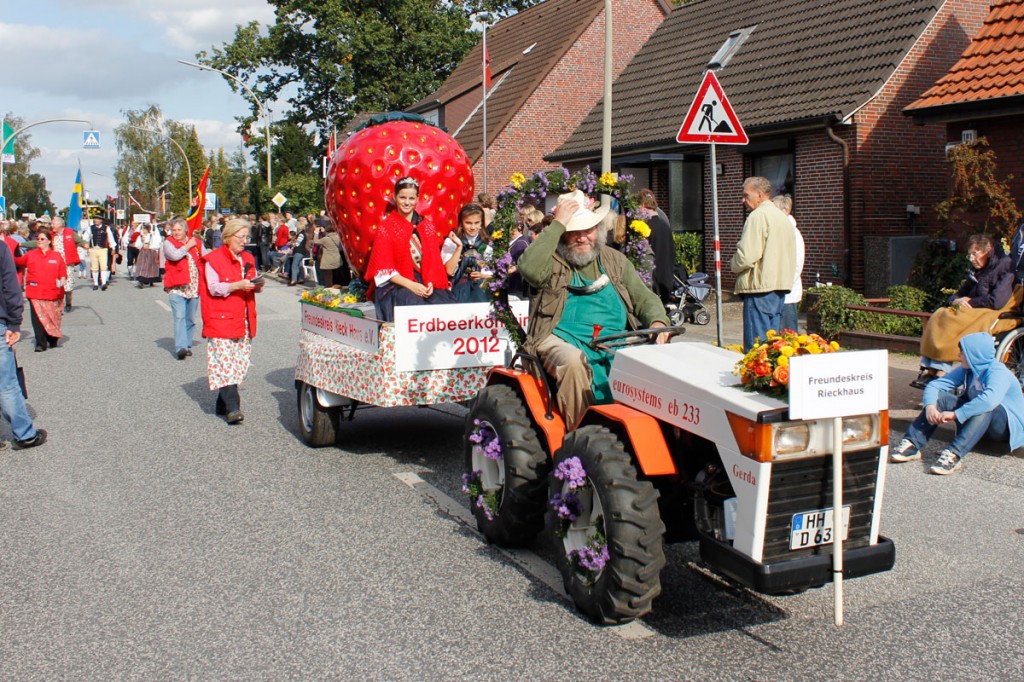 Das Besondere für mich am heutigen Tag war, dass ich den Wagen des Freundeskreises Rieck Haus und somit auch die Erdbeerkönigin 2011 begleitet habe. So durfte ich den Erntedankumzug etwas „aktiver“ als gewohnt erleben.
